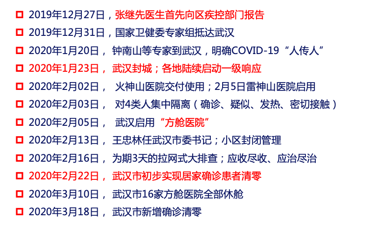 从2019年12月27日张继先医生首先向区疾控部门报告,到2020年1月23日武汉封城,各地陆续启动一级响应。从2020年2月22日,武汉市初步实现居家确诊患者清零,再到2020年3月18日,武汉市新增确诊清零。