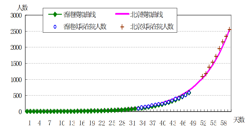 指数级增长的速度令人震惊,开始时增长速度很慢,几乎不被察觉,但是一旦超越曲线的“奇点”,它便以爆炸性的速度增长。下图是2003年SARS疫情累计在院治疗患者人数呈指数增长的态势。根据北京和香港的模拟曲线,SARS疫情传播的指数曲线在抬头以前,经历了31天时间。