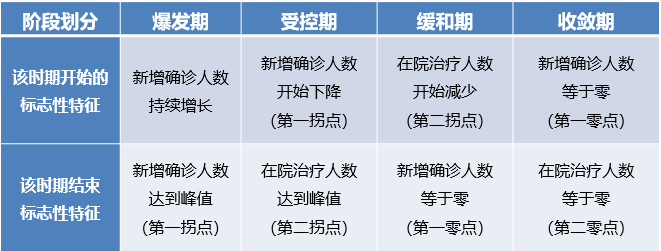 通过团队梳理,王老师将此次新冠肺炎疫情防控的过程划分为以下4个阶段:爆发期、受控期、缓和期、收敛期。