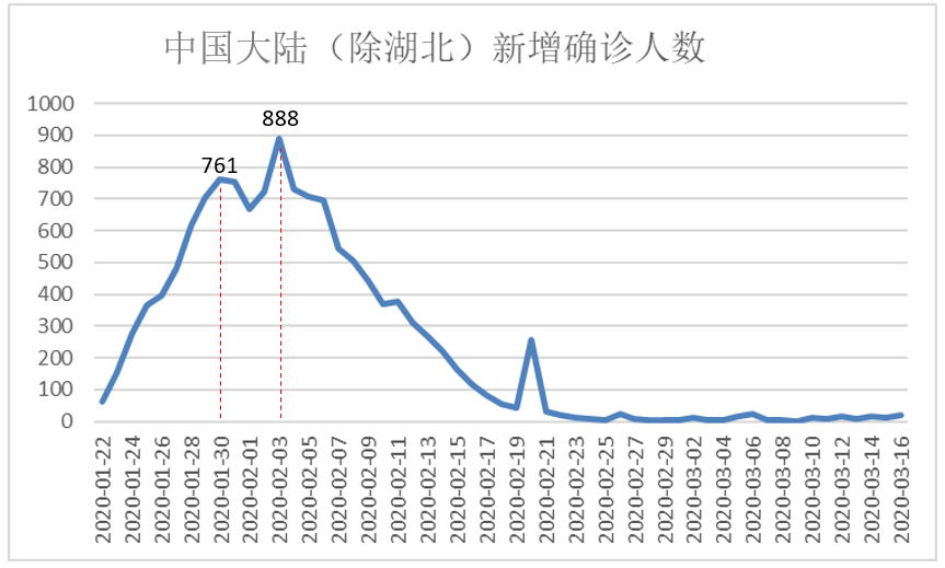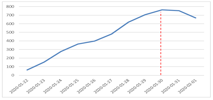 受控期的重要标志是每日新增确诊人数达到峰值后,开始下行。下图是全国(除湖北)新增确诊人数的观测数据(1月22日—2月1日)。可见,政策效果在1周后就已经显现。2月3日春节后,在部分单位复工后又开始上升,后续波动下降。