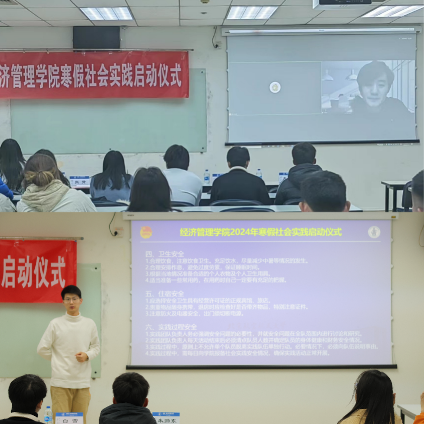 为深入学习贯彻习近平新时代中国特色社会主义思想和党的二十大精神, 延续、完善“6+X”社会实践体系, 开展有组织的社会实践工作,1月1 1 日下午1 5 时经管学院 于新主楼A928 开展2024寒假社会实践启动仪式 。 本次寒假社会实践共成立队伍15支,覆盖全校32个学院170余人。学院党委副书记高超、分团委书记白雪、经管学院指导教师代表张赞、马克思主义学院代表王海宇、专职辅导员朱帅东、兼职辅导员王心童、张舒怡及各队实践成员代表出席启动仪式。
