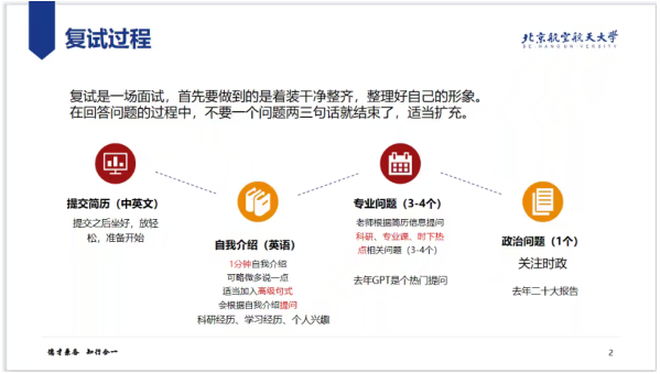 在经验分享过程中,学长学姐们分别介绍了英语、专业课、政治理论等主要考核内容;分享了与导师沟通的技巧、中英文简历准备技巧、复试准备技巧等。帮助考研同学全面了解复试流程、把握重点复习内容,科学制定复习计划。