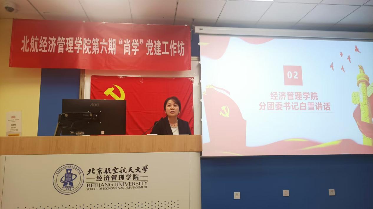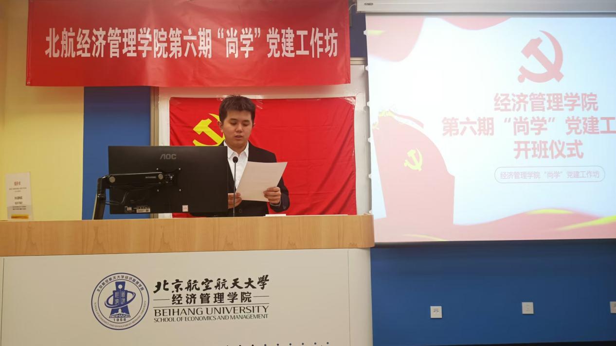 学院分团委书记白雪致辞。白雪首先对各位学员顺利进入“尚学”党建工作坊学习表示祝贺,并指出工作坊的设立是学院响应党中央号召、培养堪当强国建设、民族复兴重任的可靠接班人的重要举措。因此,白雪对本期党建工作坊的学员提出三点要求:一是要提高站位,坚持以党员的标准要求自己,争当新时代表率;二是要端正态度,珍惜学习机会,努力提升政治理论水平,强化党性修养;三是要学以致用,积极学习理论知识,用青春行动践行自己的理想信念。最后,白雪预祝各位学员学有所成。