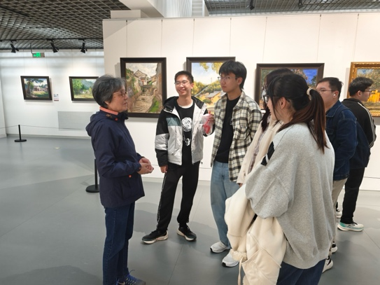 参观过程中,经管学院关工委老教师们与同学们进行了热烈交流。老教师们结合自身经历,分享了对艺术与文化的深刻理解,结合画作和专业特色讲解经管专业知识,进一步加深了同学们对于学院的归属感和文化认同感。鼓励同学们在专业学习之余多参加艺术展览,提升审美素养,培养综合素质。