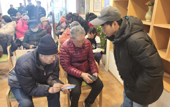 互动环节,支部同学开展一对一辅导,帮助老人安装应用、注册账户,解答操作问题,让老人体验智能手机的娱乐与便利功能,如拍照修图、设置隐私权限等。