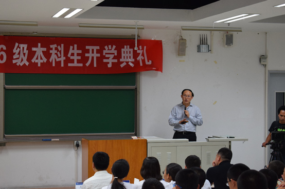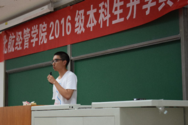 2016级新生班主任代表刘冠男以老学长的身份亲切讲话,充满激情地向新生阐述了大学学什么、大学之大等颇具哲学色彩的命题, 希望2016级同学能不断调整学习状态,度过迷茫的时光。