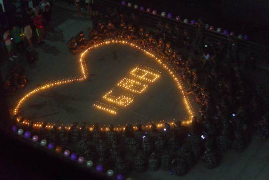 晚上八点半左右,在军训带队辅导员张羽驰和余阳杰的带领下,2016级全体新生来到一、二教学楼中间的平台处,在工作人员的引导下环坐在心形的蜡烛周围。跳动的火苗照亮了同学们的脸,在轻快音乐的烘托下,温馨愉悦的气氛充满了整个会场。