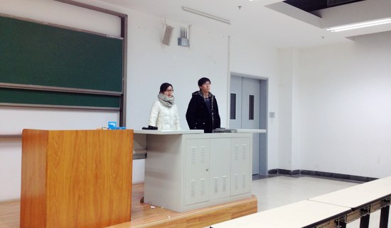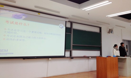 两位12级辅导员首先点明了大学期末考试的重要性。谈到考试具体事项,他们强调了考试应该诚实参考,准时考试;然后结合自己的考试经验,提出了如何利用好考期前的这一周进行复习,并强调要掌握学习的方法。除此之外,他们还特别提倡了大家一起去自习。