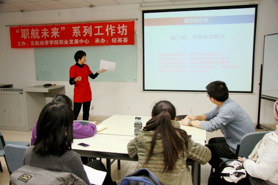 11月30日晚19点,由北航经管学院职业发展中心举办,北航经英荟承办的“职航未来系列工作坊”­——赢在简历,扬帆起航在新主楼A1028成功举办。本场工作坊的主讲嘉宾是北航学生就业指导服务中心教育咨询部,全球职业规划师赵敏老师。