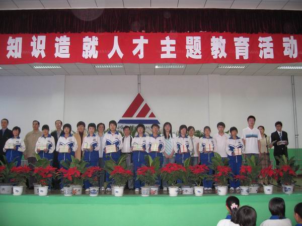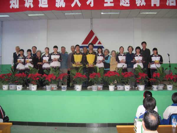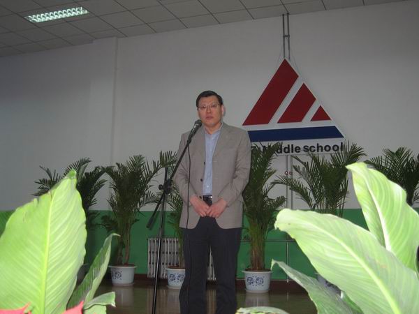 接下来是北航经管学院804教工党支部的韩立岩老师的发言。韩老师是北航金融系主任、教授、博士生导师、国务院津贴享受者、北航经管学院师德标兵。韩老师的演讲是以培根的一段名言开场的,主题是“知识打造人生”,并分别列举了一个70年代高中生的故事和一个边远地区80年代的大专生的故事。韩老师为巨各庄中学的同学们分析了一个京郊的中学生的人生价值以及新经济中的北京和密云——新一代的机会和挑战。韩老师慷慨激昂的演讲迎来了同学们的阵阵掌声。