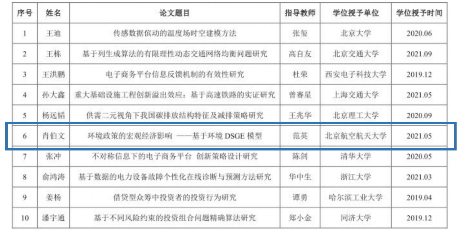 2022年下半年,管理科学与工程学会公布了2022年管理科学与工程学会“优秀博士学位论文奖励计划”评选结果。beat365亚洲版官网2021年博士毕业生肖伯文的博士学位论文《环境政策的宏观经济影响——基于环境DSGE模型》经过层层严格评选,最终入选2022年管理科学与工程学会“优秀博士学位论文奖励计划”名单,指导教师为范英教授。全国各高校共有10篇博士学位论文入选。