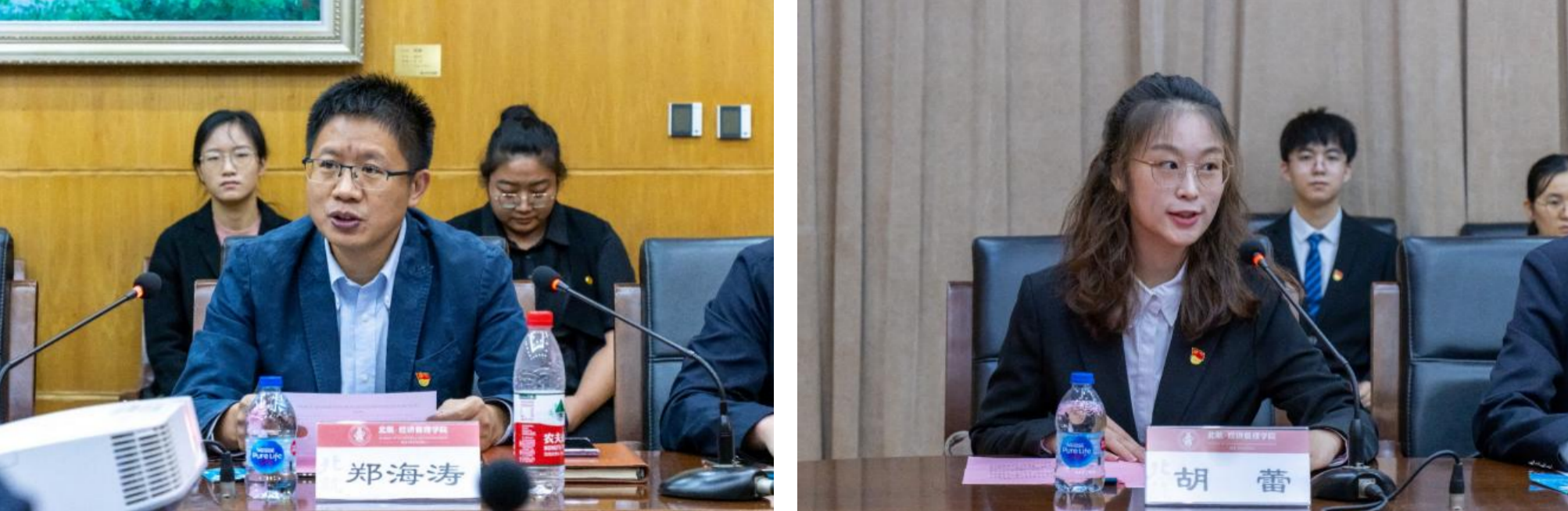 会计系学生党支部书记胡蕾做表态发言,表示在学院党委的指导下,贯通本研,跨越年级,凝聚合力,把体量小的劣势转变为“小而精”的优势,将支部建设与学业传帮带和专业建设结合起来,打造一个“强基、凝心、求实”的纵向党支部。
