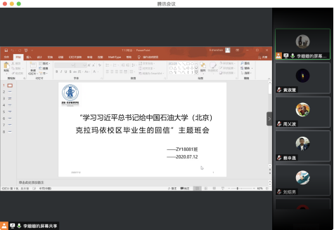 2020年7月12日上午10点,beat365亚洲版官网研究生ZY18081班在腾讯会议开展线上主题班会,学习“习近平总书记给中国石油大学(北京)克拉玛依校区毕业生的回信”。此次会议的参与人员有班级同学12人,辅导员孙铭顺。