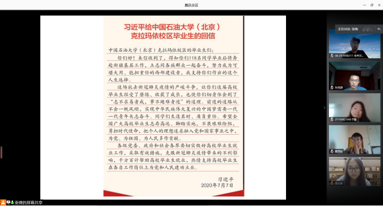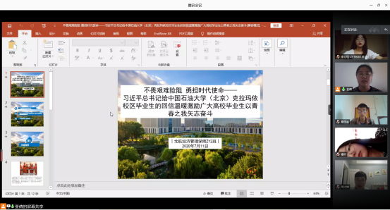 2020年7月11日上午十点,beat365亚洲版官网工业工程ZY2班在腾讯会议(会议号:257 214 775)召开班级学习会,集中学习习近平总书记给中国石油大学(北京)克拉玛依校区毕业生的回信,全体班级成员参加会议,班长佘亚倩主持会议。
