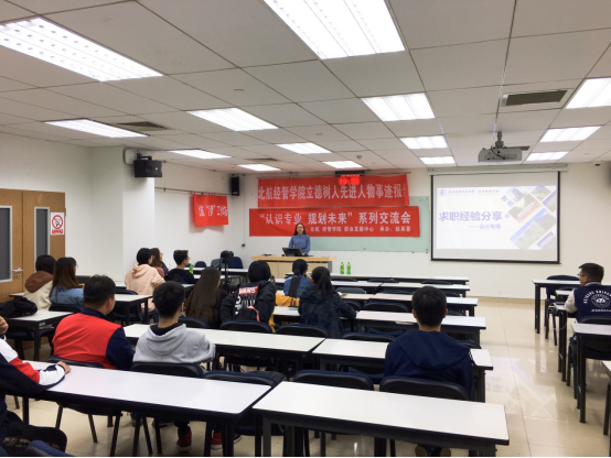 2019年3月27日晚19:30,于新主楼A1048,“认识专业,规划未来”系列交流会暨北航经管学院立德树人先进人物事迹报告成功举办。本次交流会主要面向经管学院研究生一年级的同学,为迎接即将来到的秋季招聘季,我们邀请到了现就职于中国铁路北京局集团有限公司的闫东明学姐,以及拟就职于中国建设银行总行的陶世凯学长和拟就职于德勤华永会计师事务所的张书霖学姐,他们就求职前的准备、求职过程中的经验进行了一个分享,为在校的同学们答疑解惑,树立了求职信心。