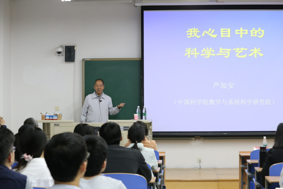 但这次讲座严加安院士没有给大家讲高深的数学,而是站在更高的思想角度讲解科学与艺术的关系。他先通过展示绘画、诗歌、书法等艺术与科学理论的互通之处,解读了科学和艺术的“大道至简、大美天成”,并阐明艺术教育可以提高人的素养。然后引经据典,解释了科学与艺术之间的共性和交融。更进一步说,“科学”与“诗歌”有很多细致的共同特性,如科学研究与诗歌创作都是对自然的深入研究;数学和诗歌都追求和谐与简洁;数学中的“对偶”与诗歌中的“对仗”异曲同工;科学研究和诗歌创作都需要直觉和想象等,这些想法都被他写进了著作《数斋随想》中。最后,严院士阐述了他对大学教育的一些思考和建议。他认为,知识积累和想象力是决定创新的两个至关重要的因素,并提出,学校的目标应该是培养能独立思考和解决实际问题的人。他的观点在学校当前关于人才培养大讨论的背景下,显得格外有意义。