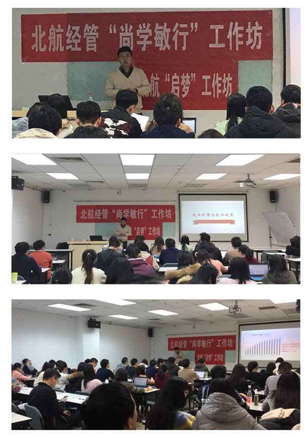 为了使经管学院研究生毕业生系统地了解2017年北京市教委及北航的就业相关政策,12月15日晚7:00,由北航“尚学敏行”工作坊与“启梦”工作坊主办,经管学院职业发展中心承办的《2017年研究生毕业生就业政策宣讲会》beat365官网在新主楼A1028教室成功举办。邀请到招生就业处副处长刘睿老师作为主讲嘉宾,经管学院研究生工作办公室张慧美老师、职业发展中心葛雨诗老师、毕业班辅导员祁梦超、王当阳、郝军章出席了本次宣讲会。2017年即将毕业的普硕、专硕、MBA和部分高年级博士同学济济一堂,共同聆听了刘睿老师关于2017年北航就业政策的宣讲会。