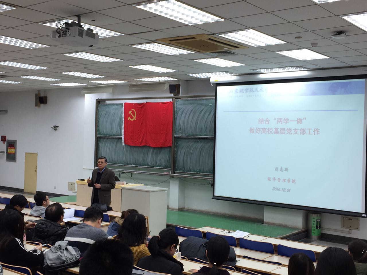 2016年12月1日晚6点30分,北航研究生党校“求真”分部第2期入党积极分子培训的第二次党课在主M楼101教室进行,来自18个不同学院的200多名入党积极分子参加了本次党课的学习。此次党课的主讲嘉宾为经管学院党委书记刘志新教授,由经管学院研究生指导主任单伟副教授主持。