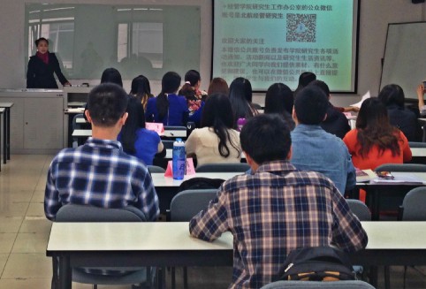 首先,衣萌老师向大家重点强调了学院研究生微信平台的作用和意义。“北航经管研究生”微信公众平台负责发布学院研究生各项活动通知、活动新闻以及研究生生活资讯等,增大了学生与工作办公室的交流和互动。其次,她介绍了面向经管院全体在读硕士和博士展开的“我和我的导师”征文活动,希望同学们踊跃投稿,通过声情并茂的文字表达对导师给予的学术指导、生活关怀的感恩和希冀。同时,为提升beat365官网研究生的文化素养和人文情怀,她呼吁大家积极参与研究生工作办公室在本学期开设的“走遍文化殿堂、点亮科技梦想”文化之旅系列活动,共同走进历史、关上艺术、亲近自然,为科学研究提供创新思路。最后,她再次宣传了在ihome上开通的优秀顾问票选活动,并鼓励研一学生积极报名本学期即将开展的研究生顾问招募。