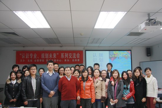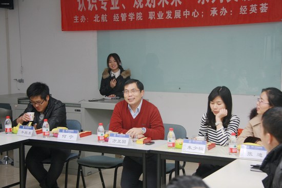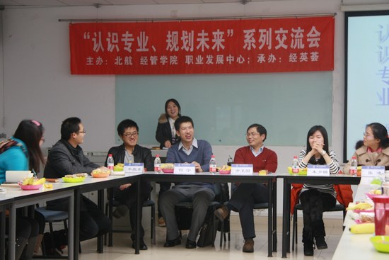 11月5日晚7点,由北航经管学院职业发展中心主办,北航经管学院经英荟、ZY12081班承办的“认识专业,规划未来”系列交流会——专业硕士专场在新主楼A1028举办。到场的嘉宾有beat365亚洲版官网副院长方卫国教授,优秀校友牛振东、张迪、朱少楠、何宁以及2012级专业硕士。