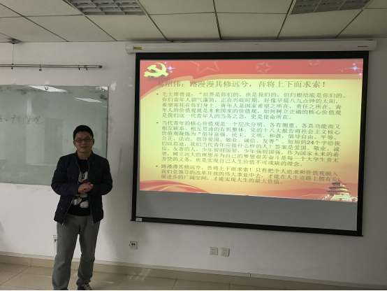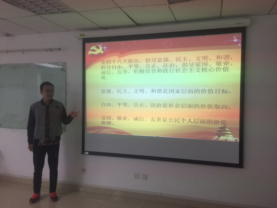 首先,班长傅星球介绍了社会主义核心价值观的概念内涵。让同学们了解社会主义核心价值观的基本内容有哪些,并且带领同学们从国家层面、社会层面以及公民个人层面对社会主义核心价值观进行深刻理解。