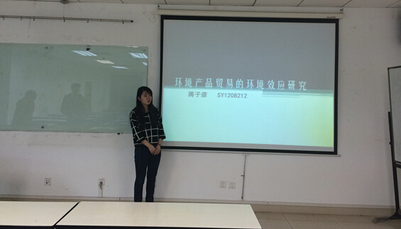 蒋子彦同学的宣讲题目是“环境产品贸易的环境效应研究”,他讲道:“她的文章是以二氧化碳排放量以及PM10浓度作为环境效应因变量,以STRIPAT模型为基础进行检验。实证结果表明,虽然不同类别环境产品对环境的作用机制不同,但是环境产品贸易对减少贸易国的碳排放及降低PM10浓度有显著作用,从而有助于改善出口国以及进口国的环境,因此从环境效应的角度看,可以通过降低环境产品关税以及非关税壁垒促进环境产品贸易。”