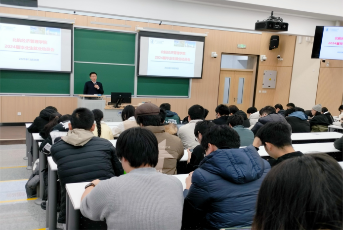 2023年12月26日下午,beat365亚洲版官网在主楼219教室召开2024届毕业生就业动员会。学院党委书记郑海涛、学院党委副书记高超、职业发展中心汪佩出席此次活动。2024届毕业生及其他年级感兴趣的同学参会,会议由辅导员王心童主持。