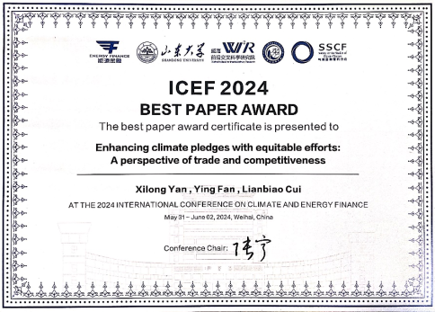 日前,由国际能源转型学会能源金融专业委员会、中国优选法统筹法与经济数学研究会气候金融研究分会主办的2024气候与能源金融国际会议(ICEF2024)上,北航经管学院在读博士生闫禧龙的参会论文“Enhancing climate pledges with equitable efforts: A perspective of trade and competitiveness”荣获“Best Paper Award(最佳论文)”奖项。