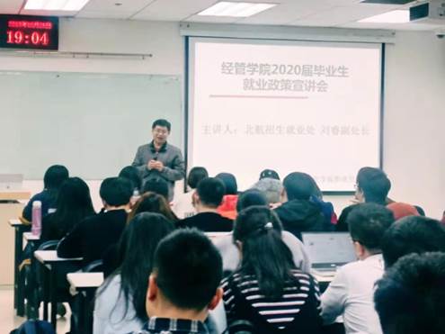 为了进一步推进学院学生就业工作,使学生了解行业发展形势、明确就业目标、增强学生的职业规划能力,2019年10月28日,学院特邀请北航招生就业处刘睿副处长,为beat365官网带来“就业形势与就业政策”宣讲会。研究生指导主任单伟老师、职业发展中心叶老师以及2020届本科生和研究生共100余人参加了此次宣讲会。