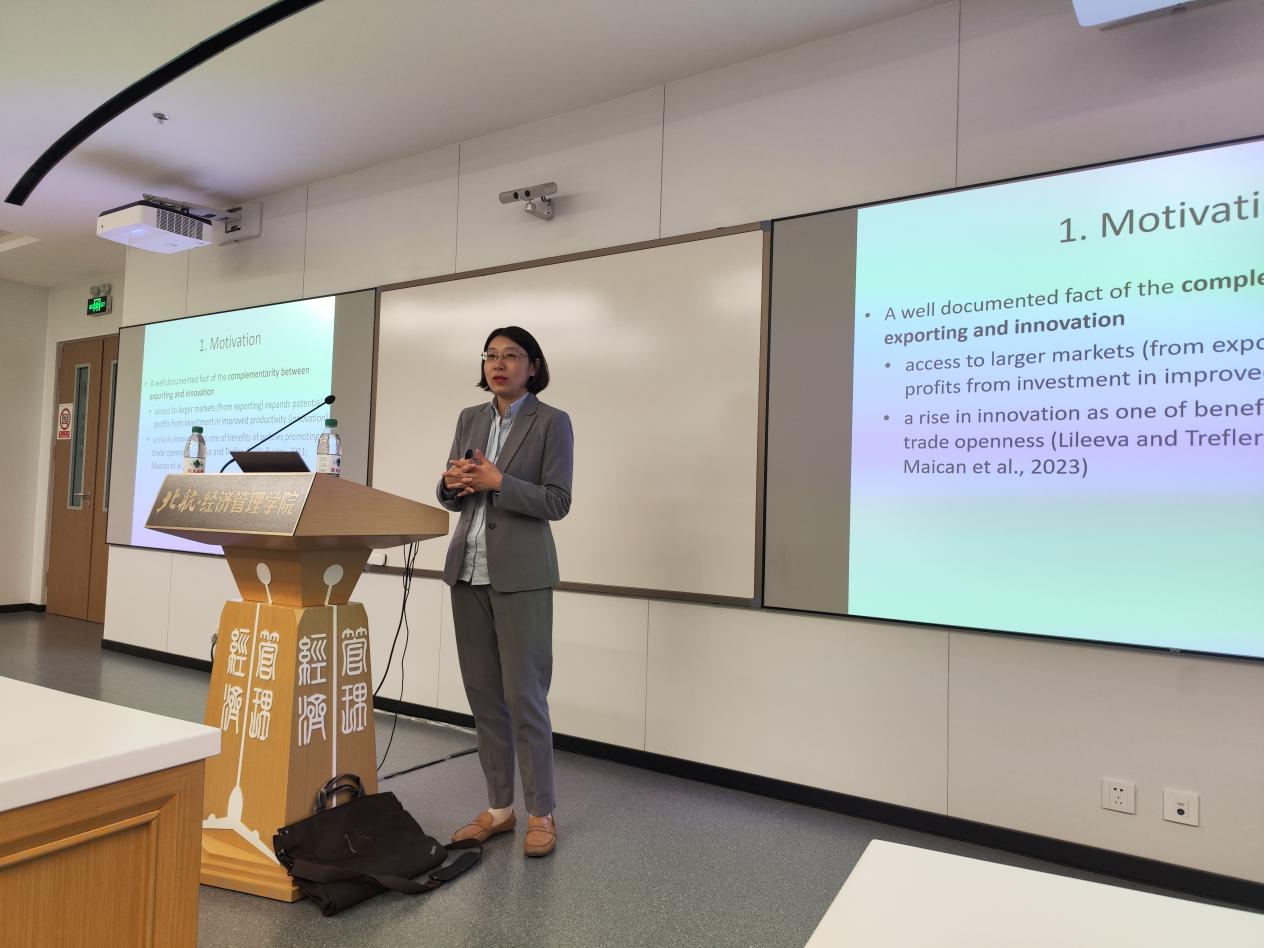 在冯教授分享的过程中,参会的老师同学积极提问并提出建议,基于企业创新、出口和内生资本结构的模型设定与冯教授进行了深入的讨论。冯教授逻辑缜密、细致入微的讲解为大家带来了新的学术启发,与会师生受益匪浅,讲座在热烈的学术氛围中圆满结束。