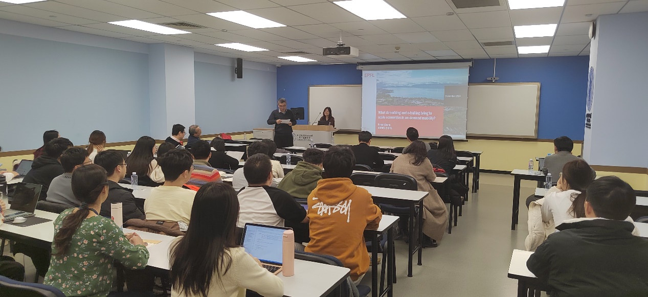 beat365亚洲版官网主办的“工程管理论坛”系列讲座2024年第16期(总第50期)于2024年12月18日下午17点在新主楼A1028教室拉开帷幕。来自瑞士洛桑联邦理工学院的助理教授Kenan Zhang受邀为广大师生作题为“What do walking and e-hailing bring to the scale economies of ride-hailing services?”的讲座。本期讲座由经管学院刘天亮教授主持,经管学院线下共三十余名师生参加了会议。