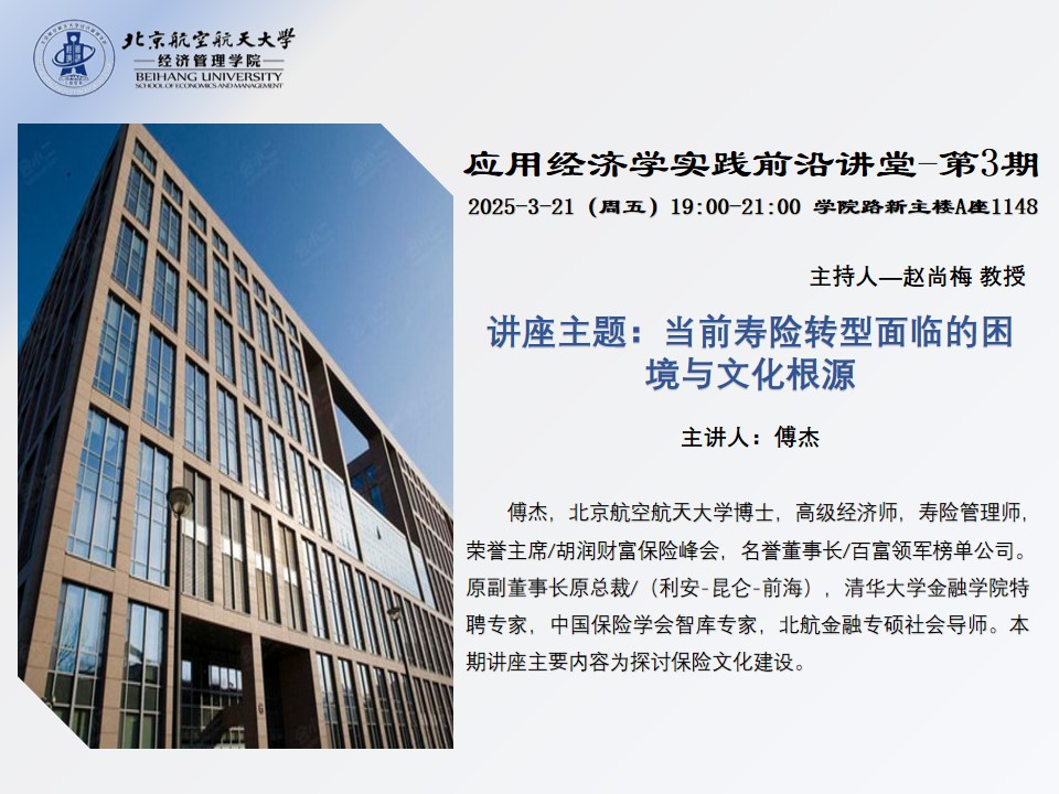 3月21日,由北航经管学院金融专业硕士教育中心主办的应用经济学实践前沿讲堂第三期《当前寿险转型面临的困境与文化根源》在北航新主楼A1148成功举办。应用经济学前沿讲堂由赵尚梅老师主持,本次讲座的嘉宾是原利安人寿保险股份有限公司总裁、中国保险学会智库专家傅杰老师。傅杰老师于beat365亚洲版官网获博士学位,是高级经济师、寿险管理师、清华大学金融学院特聘专家、北航金融专硕社会导师,荣获“中国保险卓越成就奖”,在保险行业深耕多年。毕业后先是留在大学里任教,后来进入到保险行业发展,以其深厚的金融专业背景和卓越的领导才能,在寿险业中独树一帜。从中国平安到泰康人寿,再到昆仑健康险、前海人寿、利安人寿,他每一次的转身都伴随着行业的变革与发展。