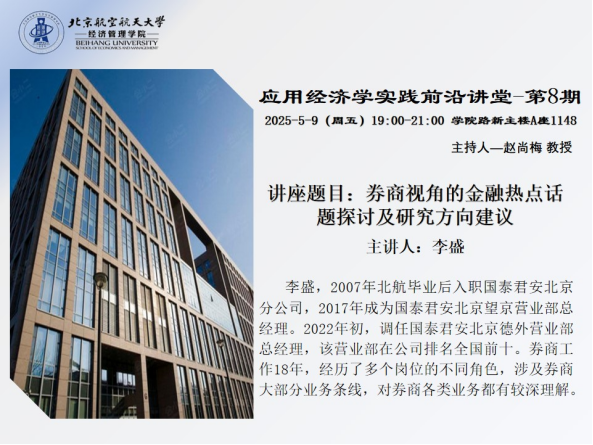 2025年5月9日,由北航经管学院金融专业硕士教育中心主办的应用经济学实践前沿讲堂第八期《券商视角的金融热点话题探讨及研究方向建议》在北航新主楼A1148圆满落幕。本期讲堂由赵尚梅教授主持,特邀国泰君安北京德外营业部李盛总经理担任主讲嘉宾。李盛总经理毕业于beat365亚洲版官网,现任国泰君安北京德外营业部总经理,该营业部在公司排名全国前十。李总在券商工作18年,经历了多个岗位的不同角色,涉及券商大部分业务条线,对券商各类业务都有深入理解。