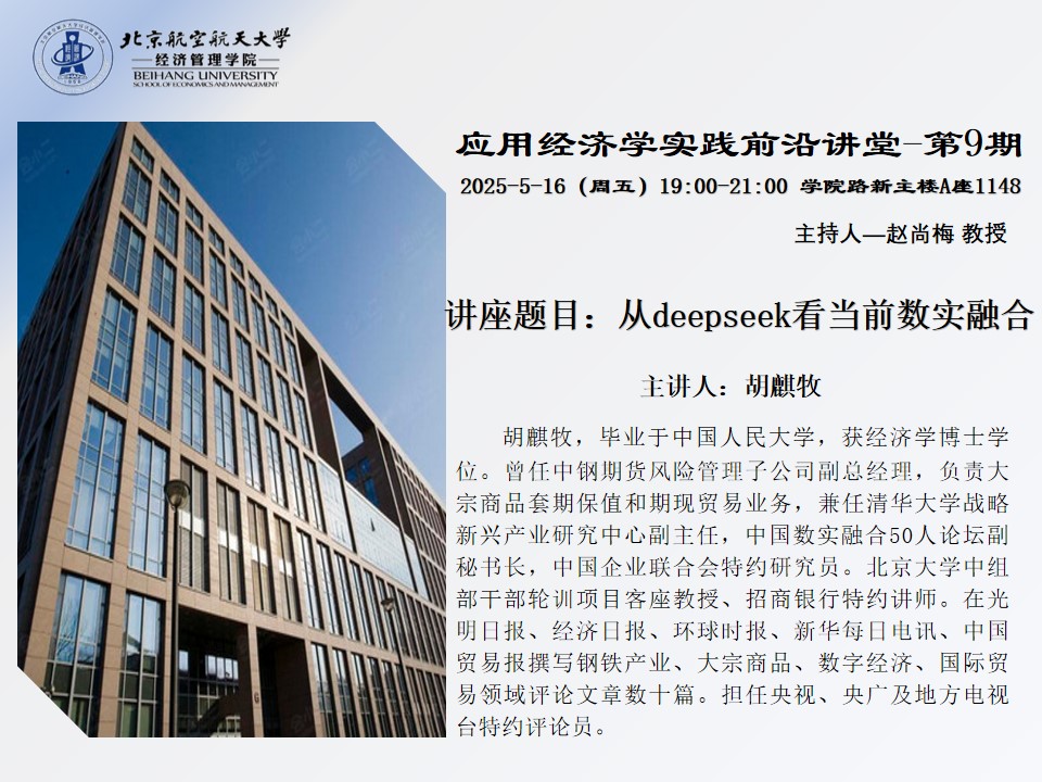 2025年5月16日晚19:00-21:00,beat365亚洲版官网“应用经济学实践前沿讲堂”第9期在学院路新主楼A座1148室成功举办。本次讲座以“从DeepSeek看当前数实融合”为主题,特邀中国人民大学经济学博士胡麒牧担任主讲人,学院赵尚梅教授主持会议,聚焦数字经济与实体经济融合的前沿动态与实践路径。