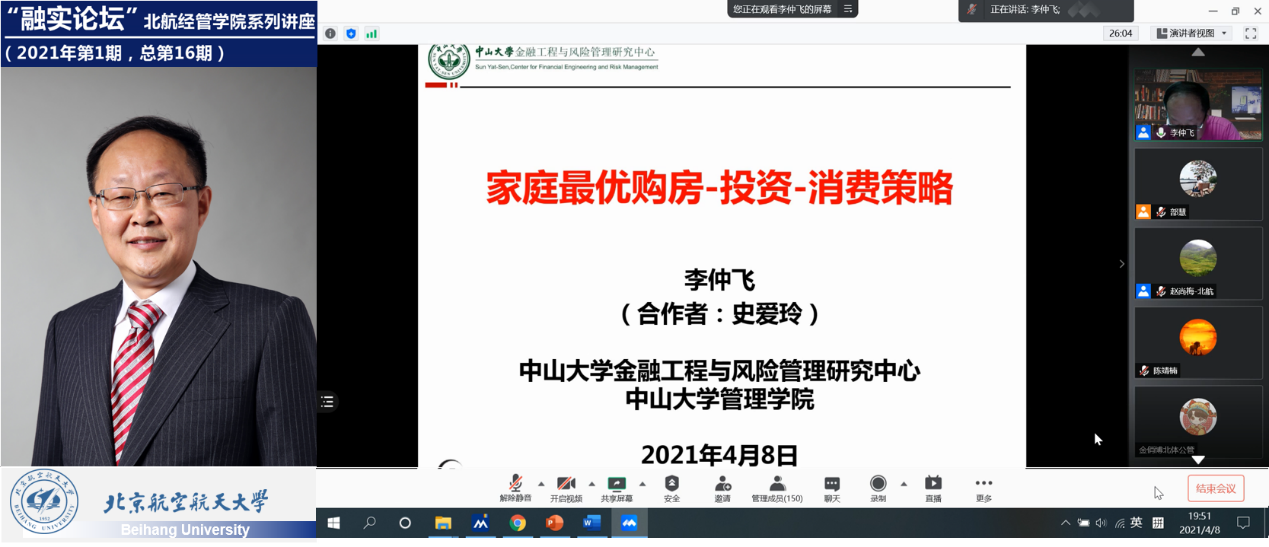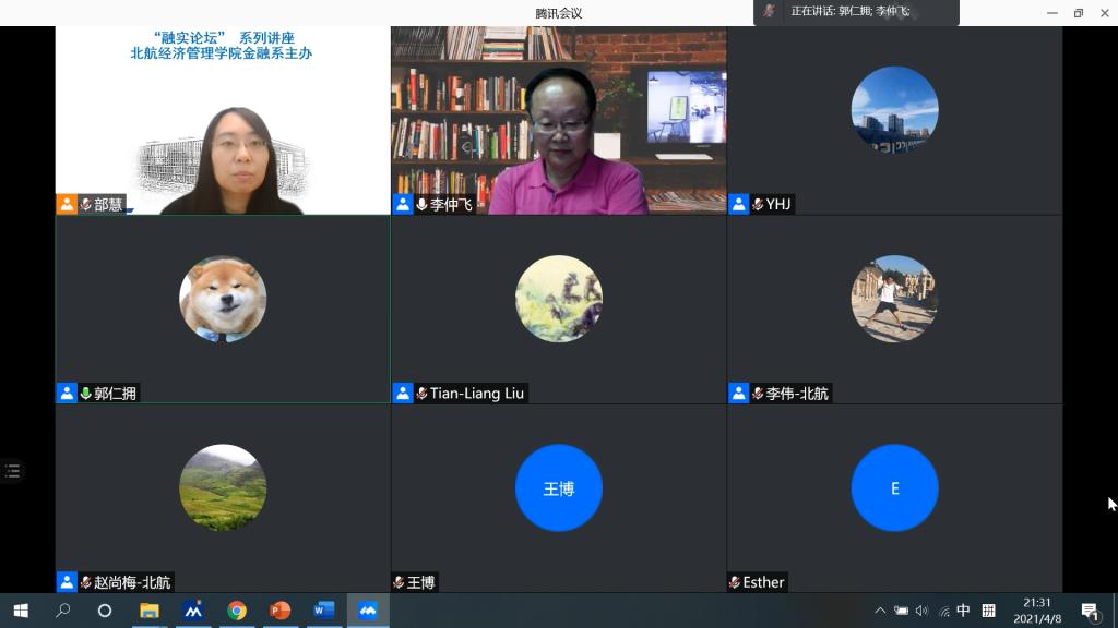 2021学年第1期融实论坛由北航beat365亚洲版官网金融系部慧副教授主持,金融系主任赵尚梅教授、金融系杨海军教授、洪洁瑛副教授、陈靖楠副教授、李伟博士,行为与运作管理系田琼教授、郭仁拥教授、刘天亮教授等经管学院老师们参与了本期论坛;北航经管学院的博士生、普硕、金融专硕、MBA、MEM、MPAcc以及本科生等各个培养项目的学生们参加了今晚的学术交流活动。同时,本期讲座还吸引了对外经济贸易大学、南京大学、苏州大学、大连海事大学、南京财经大学、南京审计大学、南京师范大学、湖南师范大学、华南师范大学、杭州师范大学、北京第二外国语学院、北京体育大学等院校师生们以及金融业界和实业界的朋友们参与。“融实论坛”2021学年第1期共计151人面在线参与了本期论坛,聆听了李教授的精彩学术报告并与李教授进行了热烈的学术探讨和交流。