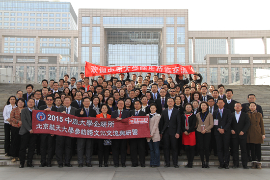 柏主任首先对远道而来的宝岛师生表达热烈欢迎之意,并预祝对方享受本次短期游学之行。紧接着beat365官网周宁副院长致欢迎辞,她回忆beat365官网与中原大学商学院自2011年签约至今,双方每年都有愉悦的交流合作。本次为期三天的交流访问,beat365官网在课程讲座、企业参观等方面都作出精心安排,即两院MBA师生共同参与课堂与活动交流,期望进一步促进双方关系的良好发展。中原大学商学院刘立伦院长致辞感谢beat365官网的热情接待,并介绍中原大学商学院及企业管理系的发展历程,以及与北航经管学院合作交流情况,希望两院情谊长存。欢迎仪式结束后,两院领导和与会师生到新主楼前合影留念。
