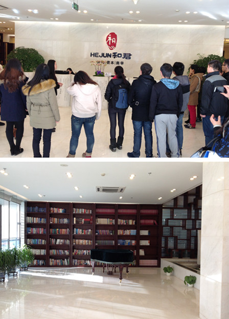 随后大家跟随工作人员在参观了地下一层和君企业总裁班的教室后来到二层,整个和君的会议室都集中分布在公司二层。走过悬挂着和君群英谱的长廊,为不影响公司员工正常办公,大家边听讲解员详细介绍边通过外围进行参观,据介绍公司会议室都是以“日月星辰、风雪雨露”命名,四足鼎、雕木、茶室、剪纸等陈列摆设无处不彰显着典雅、朴实和传统。三层开放式、自由式的办公环境一是由于咨询公司项目制的工作特点,其次也体现了公司宽松且人性化的办公氛围。参观完公司后大家被安排观看精彩震撼的企业宣传片,全面系统地了解了和君的发展历程、业务范围和企业文化等。