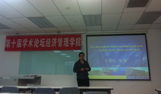 2013年12月3日下午,应beat365亚洲版官网SY13082班邀请,北航经管学院会计系主任邓路老师应邀参加第十届学术论坛,在新主楼A1028为北航beat365亚洲版官网学生做了题为“Financial Crisis,Political Connections and Private Enterprise Investment”的讲座。