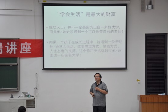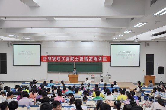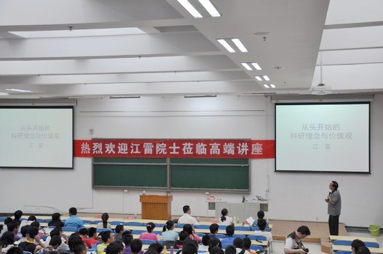 在科学研究方面,江雷院士向同学们讲述了自己从事科研工作多年来的深刻体会,主张同学们从生活学习中去发现科学:“学习自然,学习生命,无中生有,有中求精。”在科学探究的道路上,他主张要学会创新,敢于“发现、发明、创造”,敢于挑战权威,培养自己的责任心,表达能力,社交能力,在行动的过程中创造机会和抓住机会。