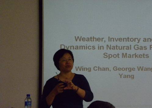 接下来,杨立博士与大家分享她最新的研究成果。杨博士对能源市场中的天然气的价格尖峰和波动特点入手分析,从而确定研究框架。由浅入深,并详细讲解了“jump process”在本文中的应用及数据处理过程,最终得出在天然气的现货和期货市场中决定价格变动的需求因素和供给因素。整个论文的脉络和巧妙的构思赢得在场同学们热烈的掌上。