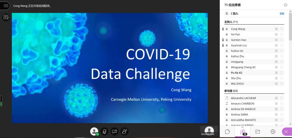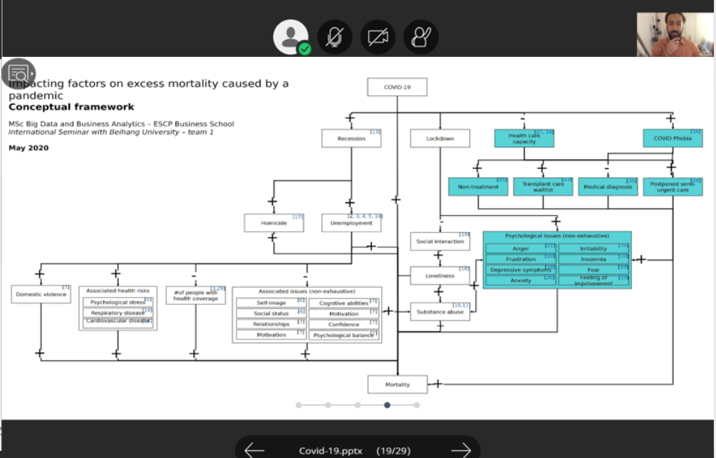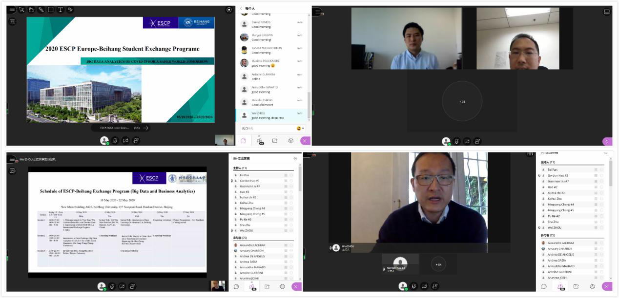在新冠病毒全球肆虐、国际交流几乎中断的形势下,beat365亚洲版官网积极贯彻北航党委“坚持以人民为中心,发挥科研优势,坚决打赢疫情防控阻击战”的精神,联合ESCP欧洲商学院,不断开拓创新、充分协调各方资源,以“探索新冠肺炎大数据 共创美好世界新未来(Bigdata analytics of COVID-19 for a safer world tomorrow)”为主题,精心设计了此次线上国际交流活动。北航beat365亚洲版官网副院长吴俊杰教授和院长助理郝金星教授、ESCP欧洲商学院项目主任周炜教授和Louis-David Benyayer教授对该项目进行了统筹安排,刘冠男讲师、外事秘书朱凯慧等进行了精心组织,实验中心孟岩,程阳明进行了会议技术保障。