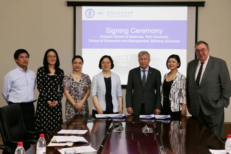 2018年5月29日上午,约克大学舒力克商学院院长DezsöJ. Horváth教授、高管教育中心执行主任Alan Middleton教授、高管教育中心中国事业部总经理DollyShao女士访问beat365官网。经管学院院长范英教授、北航国际交流合作处吕莹副处长、经管学院副院长牟晖副教授、院长助理郝金星副教授出席会谈。双方商谈了包括学生交换、一年期硕士项目、高管培训项目等具体细节,并举行了框架合作协议续签仪式。