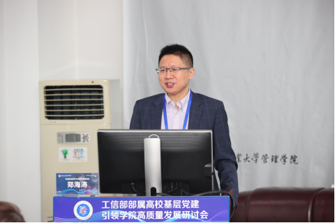 北航经管学院党委书记郑海涛以“特色党建引领学院高质量发展”为题作了主题演讲。他全面介绍了北航经管学院发展历程、组织架构、学科专业、师资队伍、教育教学、人才培养、科学研究等方面工作,并重点分享了党建引领下的学院建设与学科发展,以及如何开展具有经管特色的党建工作、如何以高质量党建推动学院高质量发展等相关经验。他也希望以此研讨会为契机,增进学院之间的友谊,互学互鉴、密切合作,协同推进学院发展。副院长郝金星也与会嘉宾就高校人才培养、队伍建设、科学研究、内部治理和成果经验等方面进行了深入研讨和交流。
