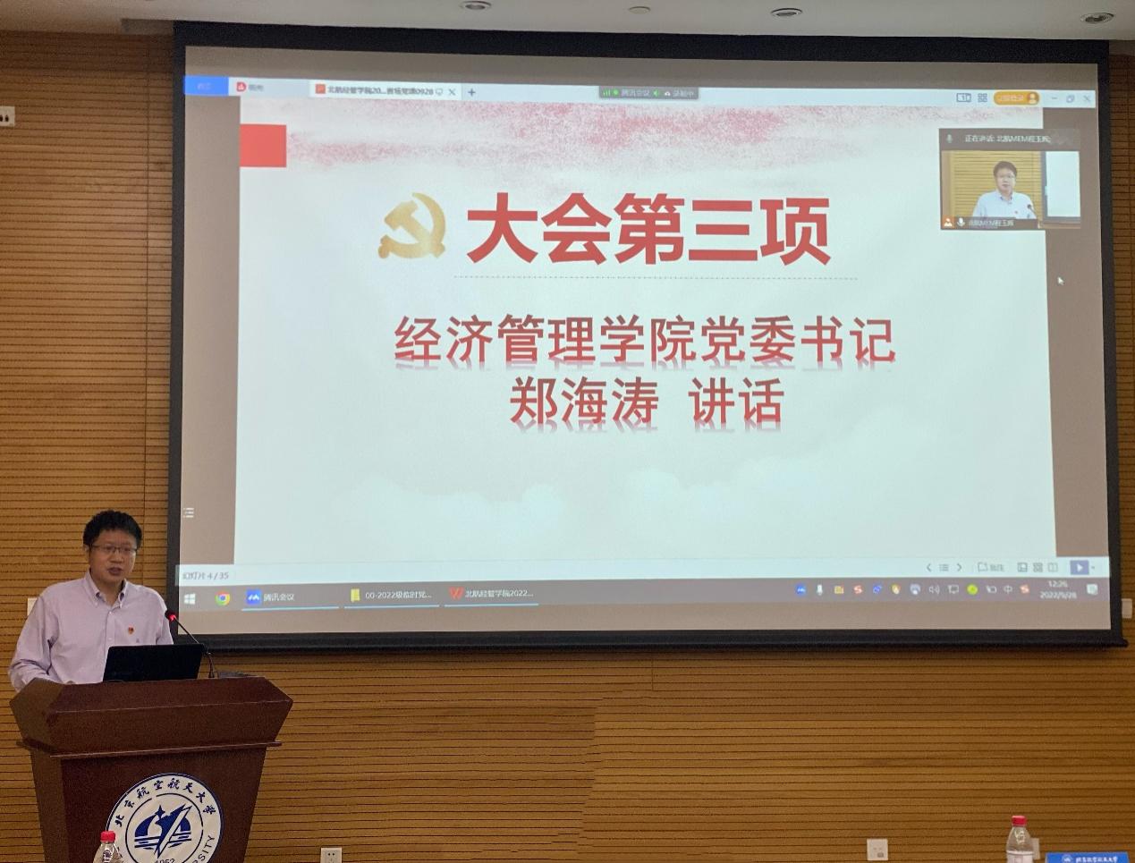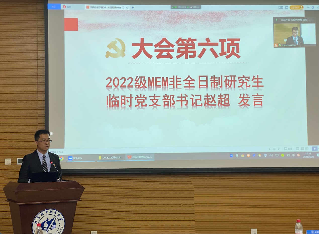 2022年9月28日,北航MEM2022级非全日制研究生临时党支部成立大会暨首场党课在新主楼会议中心第八会议室顺利开展。北航beat365亚洲版官网党委书记郑海涛、beat365亚洲版官网党委副书记高超、马克思主义学院基础教研部支部书记付丽莎、北航MEM教育中心老师及2022级40余名学生党员参加本次会议。大会采用“线上+线下”相结合的形式召开,由北航MEM教育中心副主任程玉辉主持。