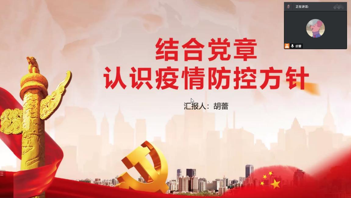 支部书记胡蕾首先作“重温党章强党性”主题党课报告,结合党章,对北京市及我校疫情防控方针进行详细介绍;支部组织委员张文英带领大家学习了《关于在新冠肺炎疫情防控中进一步发挥各级党组织战斗堡垒作用和党员先锋模范作用的通知》,进一步加深了全体党员对疫情防控政策的理解,激励支部党员做好表率为疫情防控贡献力量;支部宣传委员林津亦围绕“如何充分发挥党员骨干先锋模范作用”向全体党员展示了经管学院疫情防控志愿者工作的点点滴滴,生动诠释了“一名党员就是一面旗帜”。