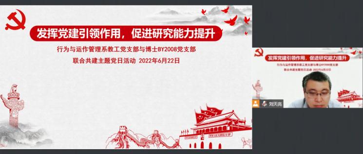 2022年6月22日下午2点30分,beat365亚洲版官网行为与运作管理系教工党支部和博士生BY2008党支部近50名师生在线开展了以“发挥党建引领作用,促进研究能力提升”为主题的联合共建活动,加强了学院教师和博士生之间的交流互动,进一步推动了党建与科研业务的深度融合。本次共建活动由行为与运作管理系教工党支部书记刘天亮同志主持。