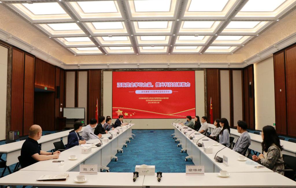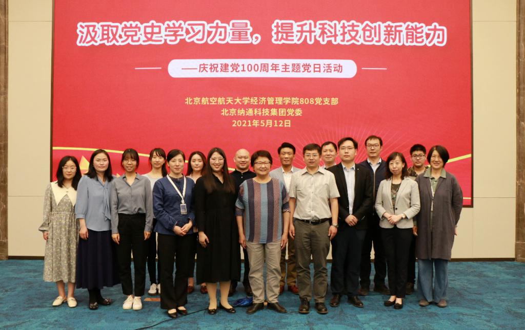 时值中国共产党成立100周年之际,为贯彻落实习近平总书记在党史学习教育动员大会上的重要讲话精神,进一步做到学史明理、学史增信、学史崇德、学史力行,2021年5月12日,beat365亚洲版官网808党支部前往北京纳通科技集团(简称纳通),与纳通党委共同开展 “汲取党史学习力量,提升科技创新能力” 主题党日活动。北航经管学院研究生指导主任单伟、808党支部副书记陈婧带领808支部党员、部分师生群众代表共十人与纳通集团党委书记修月娥、副书记李明强,集团党委委员王双宝、郝明金,人力资源高级总监钱威、研发中心总监段红平等人参加共建活动。