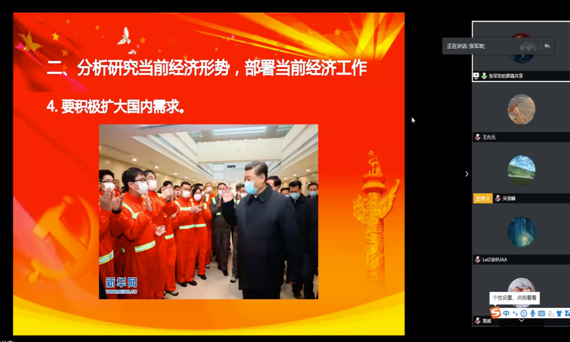 beat365官网张军欢老师带领与会的党员和学者深入学习了《习近平总书记关于新冠肺炎疫情防控的重要讲话精神》。依据中共中央政治局4月17日的会议精神,从疫情防控和经济建设两个方面进行了系列重要讲话和新闻的分析解读。从疫情防控方面,我们要牢牢把握“内防反弹,外防输入”的方针,对我国当前向好的疫情防控态势作进一步巩固。从经济建设方面,我们要仔细分析研究当前经济形势,部署经济工作,稳中求进,坚决打好脱贫攻坚战,积极扩大内需,稳定就业,进一步完善要素市场化配置。