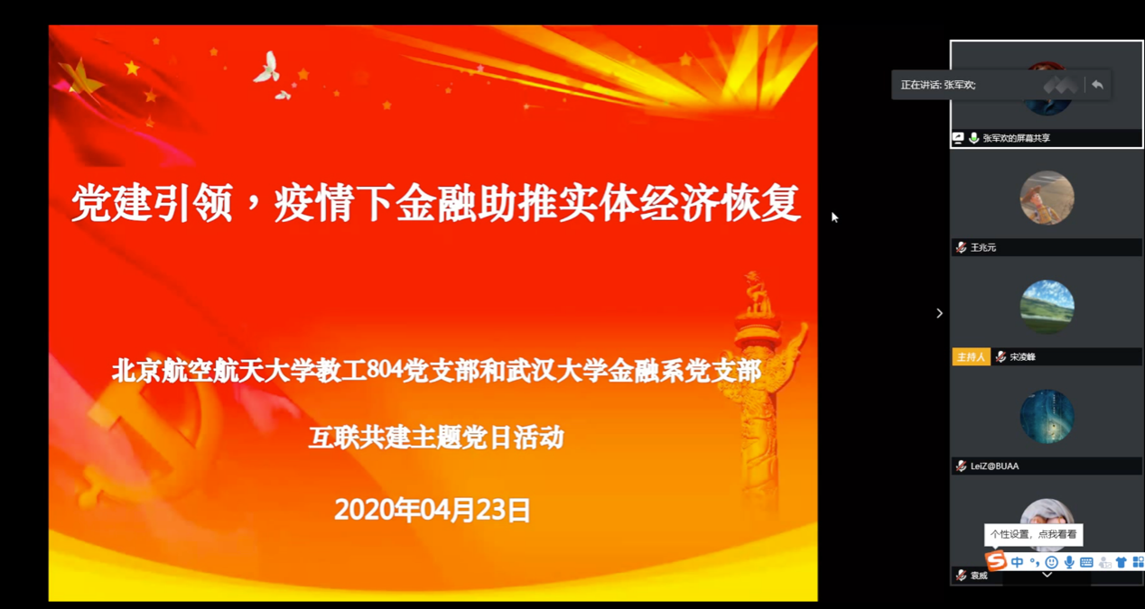2020年4月23日下午,beat365亚洲版官网教工804党支部联合武汉大学经济与管理学院金融系党支部在线召开“党建引领,疫情下金融助推实体经济恢复”的互联共建主题党日活动。