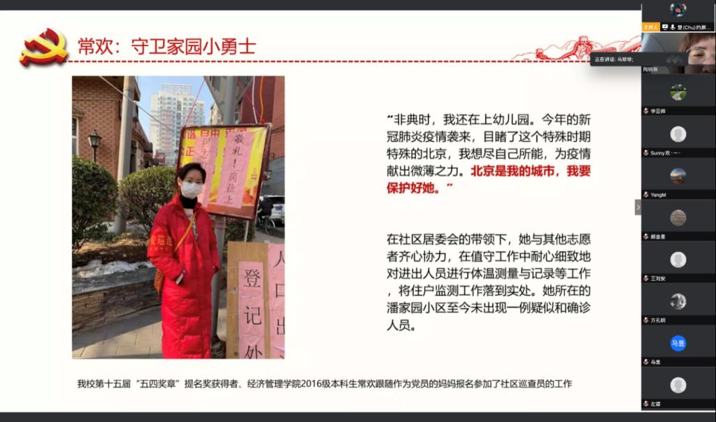 2018级MPAcc学生党员常梦瑶在北京市集散点负责湖北地区返京人员的转运工作。她介绍了北京市对湖北居民返京的全过程闭环管理政策。在对比参与庆祝新中国成立70周年表演和此次防控疫情的经历时,她表示,这些经历让她感受到祖国的强大和凝聚力,不光能在繁华盛世举国同庆,更能在危机关头保卫人民。